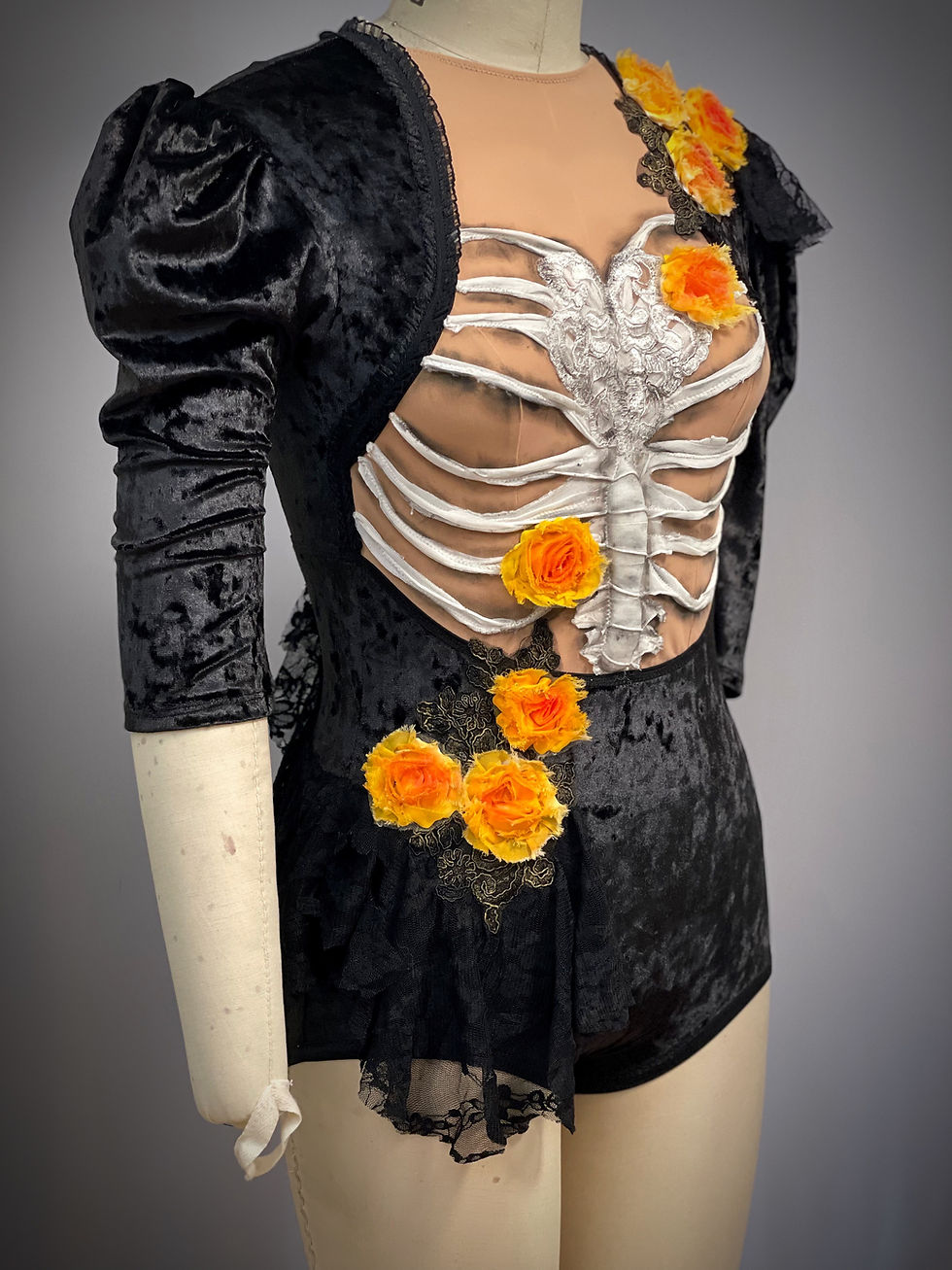 For this costume I used stretch crushed velvet and rose gold metallic mesh. The entire costume is lined with heavy weight powernet for sturdiness and support. The open back is very low plunge but I can attest after trying it on that there won't be any crack slips! It's well-covered and secure.When I'm creating a costume with an Asian look, I always hear my Japanese mother's voice guiding me. She always tells me to use "Opposite color. Don't use matching color like American style." Which was what she used to tell me when she would combine obis and kimonos together. So, for this I used a deep teal, corally, rosey pinks, bright pink, and greens.